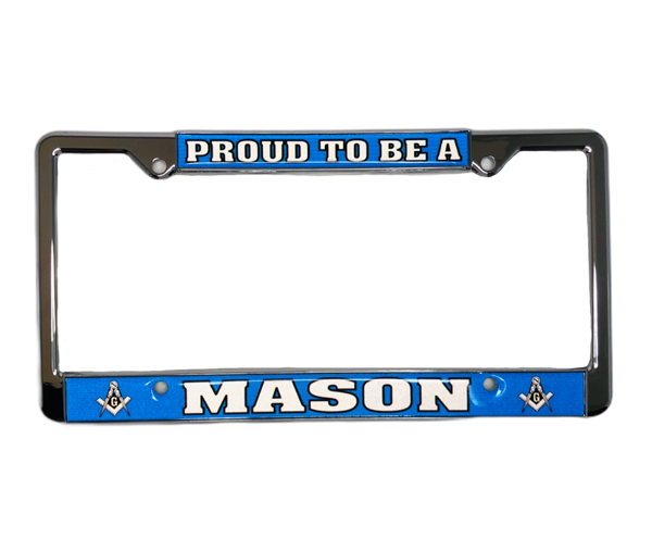 The background of the frame is blue with white lettering. Frame reads "Proud to be a" on top and "Mason" on the bottom. There is a masonic logo on each side of MASON. All of the lettering and images are digitally printed on to a high quality permanent adhesive substrate and then, a Mercury free polyurethane resin is applied to protect the image. This allows for years of color fast exposure and adds life to the imprint. This product is made in the USA. The frame is a chrome plated plastic. *Check with your local authorities on restrictions.