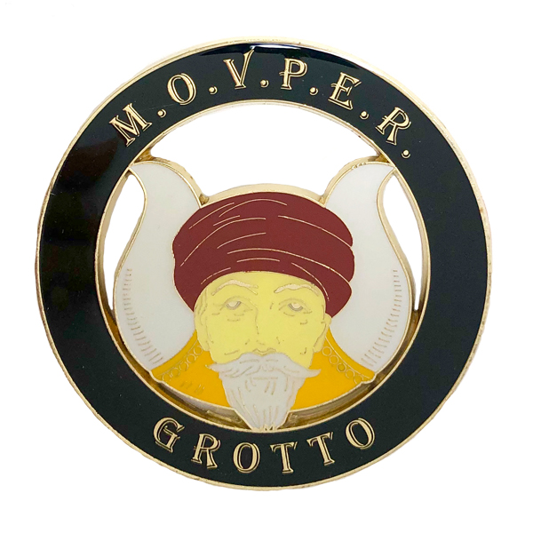 Deluxe Grotto car emblem has a black ring with the red Grotto logo in the center. The lettering M.O.V.P.E.R. is on the top and Grotto is on the bottom of the car emblem. The car emblem is 3" in diameter and is made of zinc metal with a strong peel and stick backing.