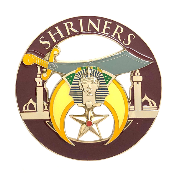 Deluxe Shrine Car emblem with a maroon background. The word "Shriners" is across the top of the car emblem and the sword and crescent are in the center. It is 3" in diameter and is made of zinc metal with a strong peel and stick backing.
