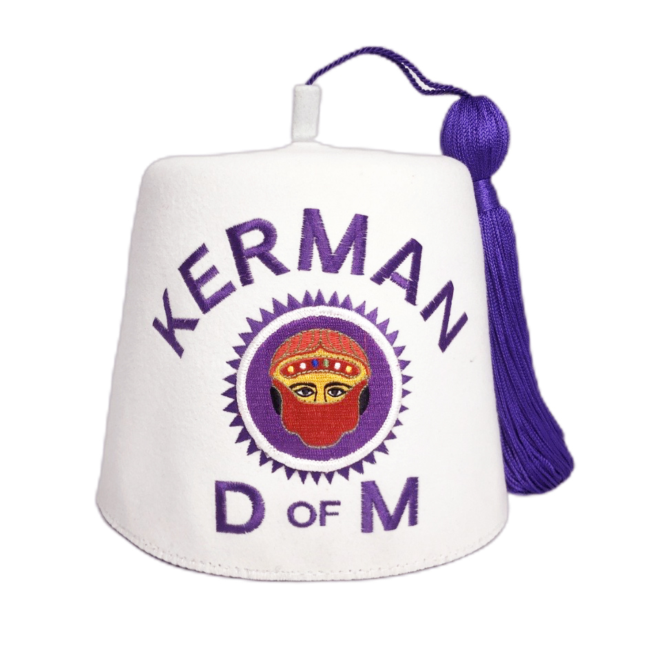 Daughters of Mokanna Past Might Chosen One fez is white with purple embroidery. The Daughters of Mokanna embem is out line with a purple border. The fez includes an 18" purple tassel and a white zipper bag. The fez body is 100% wool felt with ventaliated top.