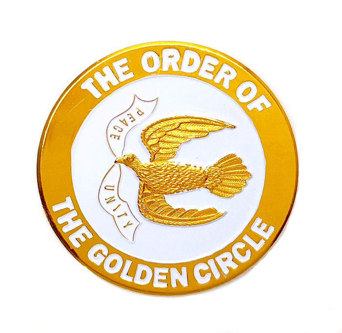 This car emblem is the golden circle logo with a gold-tone circle border and white background. In the center of the circle is the Golden Circle logo. Around the border is the wording, The Order of The Golden Circle. This car emblem is made out of long lasting aluminum and has a self adhesive backing. It measures 3 inches.