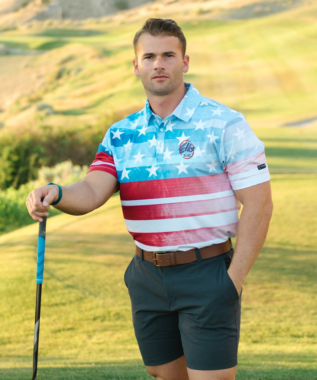 Elks USA flag shirt. This Yatta golf shirt has an all over american flag design and is 100% polyester. The Elks USA logo is located on the left chest.