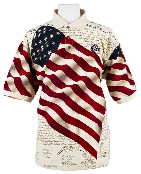 This Waving Flag Constitution Shirt features a stunning all-over design inspired by the U.S. Constitution. The Elks USA logo is elegantly embroidered on the left chest, adding a distinguished touch. Perfect for patriotic events and Elks gatherings, this shirt blends style and pride effortlessly.
