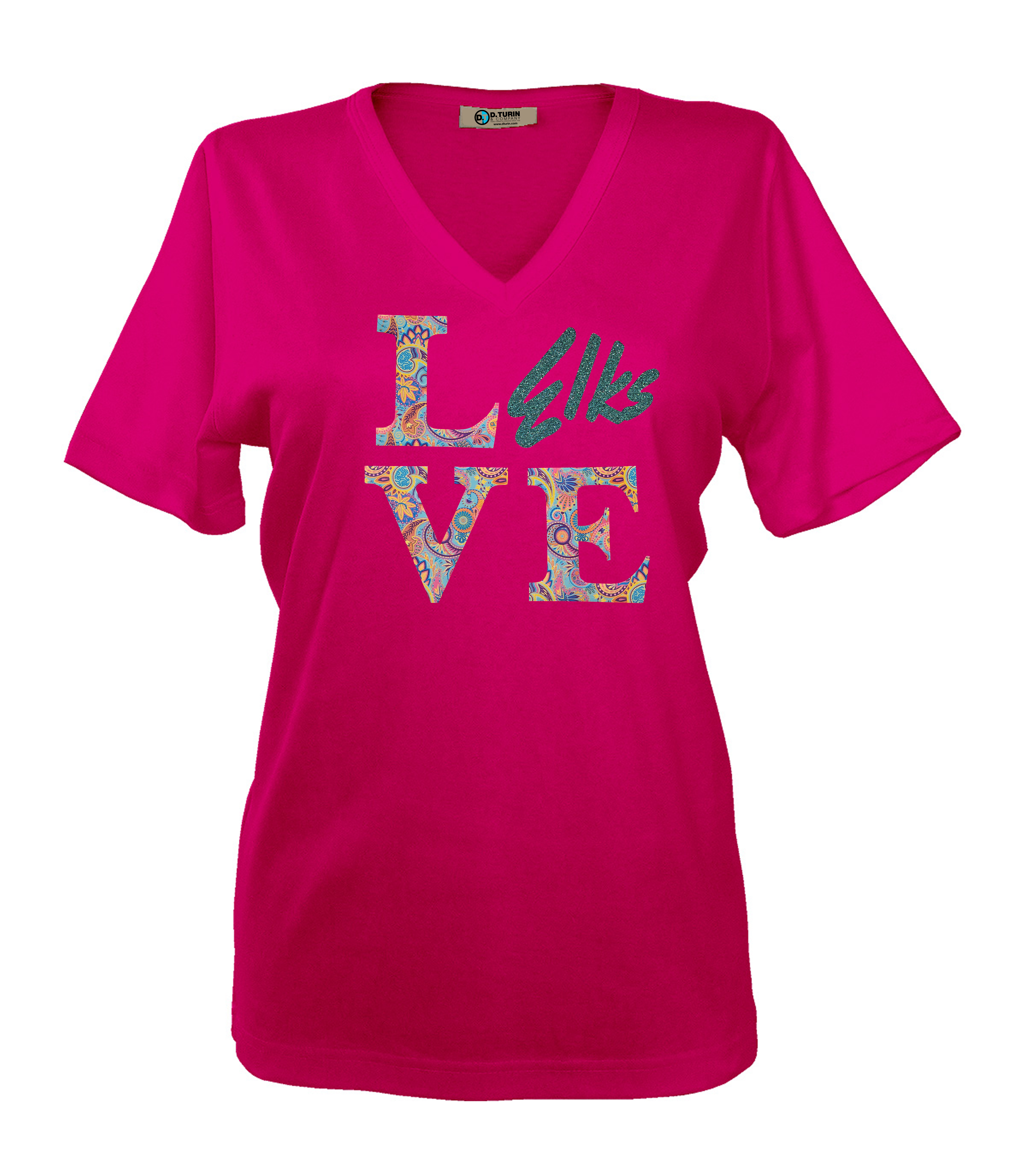 Elks ladies Love design shirt. This popular design is on a Raspberry Pink shirt with patterned and glitter vinyl. They are a 60/40 cotton/poly blend.