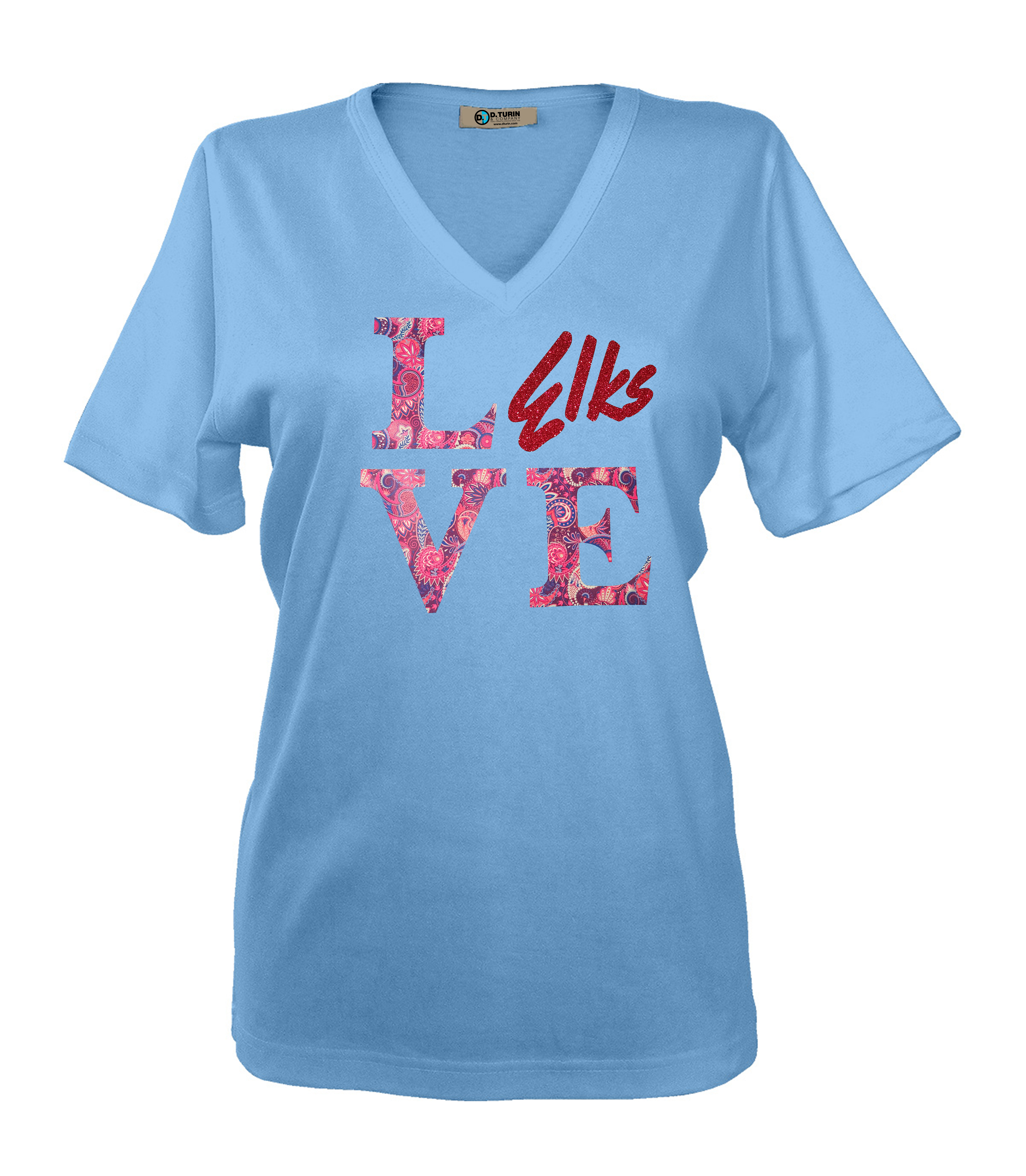 Elks ladies Love design shirt. This popular design is on a aqua shirt with patterned and glitter vinyl. Shirts are true ladies’ shirts with a generous cut. They are a 60/40 cotton/poly blend.
