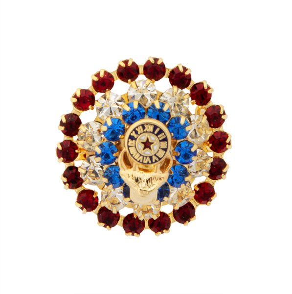Elks Rhinestone Red, White, Blue Pin. This circle pin has a safety catch pin back for comfort and security. The elk clock is located in the center of the pin. The pin has a diameter of 1". MADE IN THE USA!