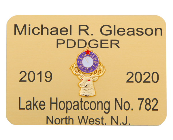 This name tag comes in a variety of colors and has the Elks Clock in the center. The name tag measures approx 3 1/4 by 2 1/4 and can have up to 5 lines of information. Please reference the picture for the information you would like on the name tag. The name tag has a magnetic backing, if you need a pin back please let us know.