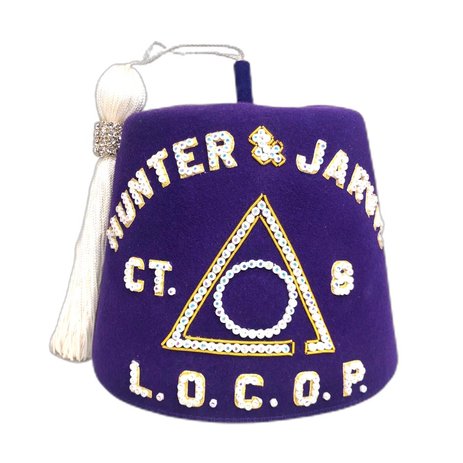 Circle of Perfection jeweled fez. The fez is done with 5/8"plastic back rhinestone letters. The fez body is 100% purple wool felt and the fez includes 4 rows of rhinestone banding on the tassel. The price includes LOCOP and the emblem. Court name and number are an additional $6.00 a letter.
