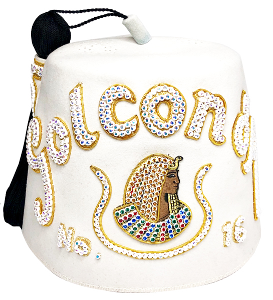 Deluxe double row Daughters of Imperial Court jeweled fez. The rhinestones are over gold Mylar metallic thread. The tassel is 24" in length and has a deluxe crescent shaped tassel holder with rhinestones over gold metallic thread to match the lettering. Also included is a white fez stiffener and a custom embroidered lining. The fez body is 100% white felt with a ventilated top. This fez is available with plastic back or metal back rhinestones and is outlined in gold wire. The price also includes your court number and the rhinestone Daughters head emblem.