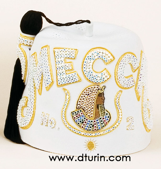 Deluxe triple row Daughters of Imperial Court jeweled fez. The rhinestones are over gold mylar metallic thread. The tassel is 24" in length and has a deluxe crescent shaped tassel holder with rhinestones over hand embroidered gold metallic thread to match the lettering. Also included is a white fez stiffener and a custom embroidered lining. The fez body is 100% white felt with a ventilated top. This fez is available with plastic back or metal back rhinestones and is outlined in gold wire. The price also includes your court number and the rhinestone Daughters head emblem.