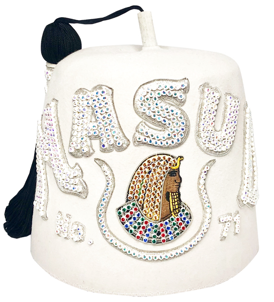 Deluxe triple row Daughters of Imperial Court jeweled fez. The rhinestones are over silver mylar metallic thread. The tassel is 24" in length and has a deluxe crescent shaped tassel holder with rhinestones over hand embroidered silver metallic thread to match the lettering. Also included is a white fez stiffener and a custom embroidered lining. The fez body is 100% white felt with a ventilated top. This fez is available with plastic back or metal back rhinestones and is outlined in silver wire. The price also includes your court number and the rhinestone Daughters head emblem.