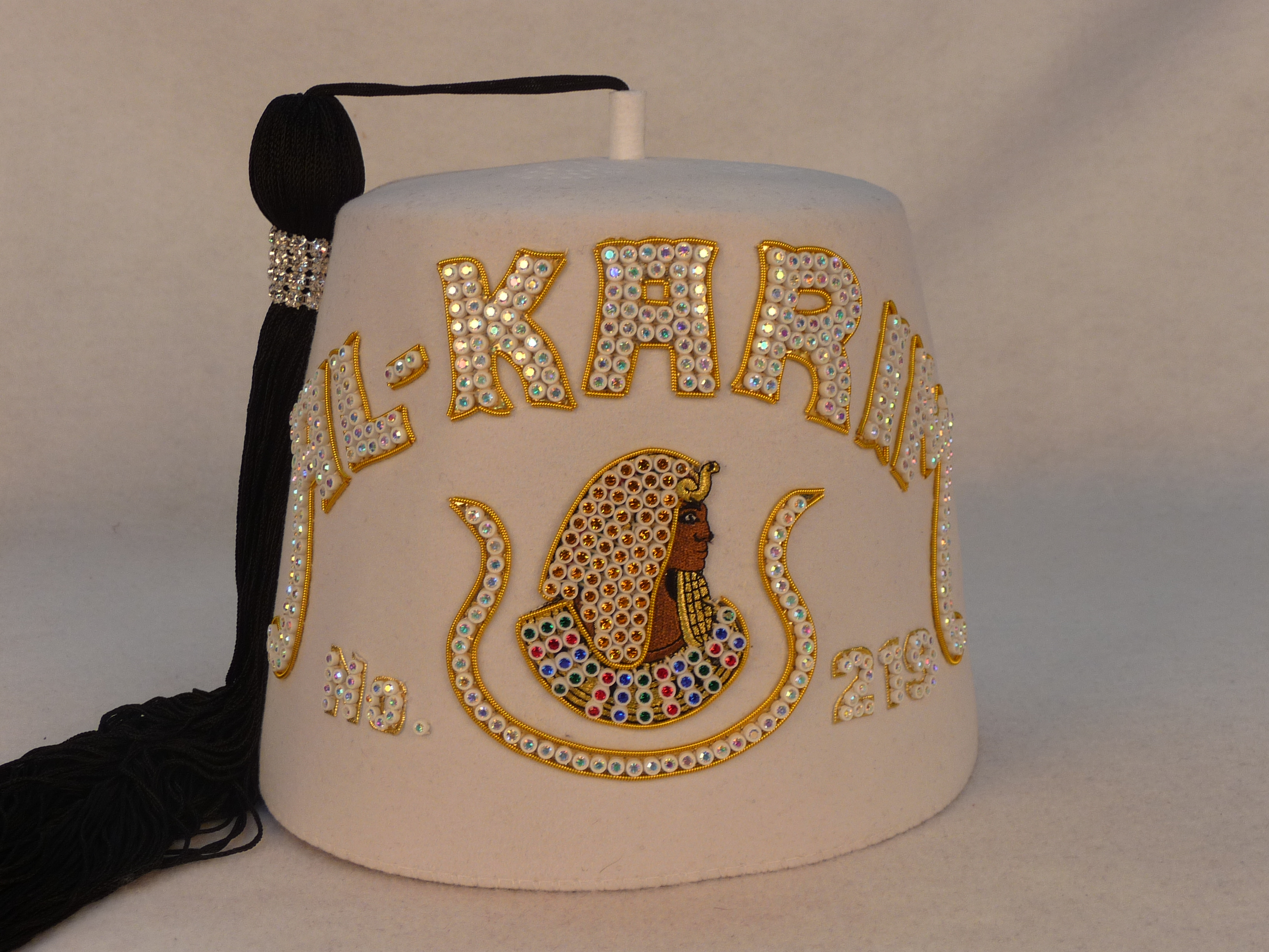 Double row Daughters of Imperial Court jeweled fez with your court name. This fez includes a 24" tassel and has 4 rows of rhinestone banding, stitched down at the top of the tassel. Also included is a white fez stiffener. The fez body is 100% white felt with a ventilated top. This fez is available with AB plastic back or crystal metal back rhinestones. The price also includes your court number and the rhinestone Daughters head emblem.