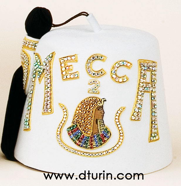 Special Double/ Single Row Deluxe Daughters of Imperial Court jeweled fez. This fez has two rows of rhinestones on the first and last letters. The remaining letters are stitched with a single row of rhinestones. The rhinestones are sewn over gold Mylar embroidered thread. This fez comes with large AB metal back rhinestones. The tassel is 24" in length and has a deluxe crescent shaped tassel holder with rhinestones and gold wire. Also included is a white fez stiffener. The fez body is 100% white felt with a ventilated top. The price also includes your court number and the rhinestone Daughters head emblem.