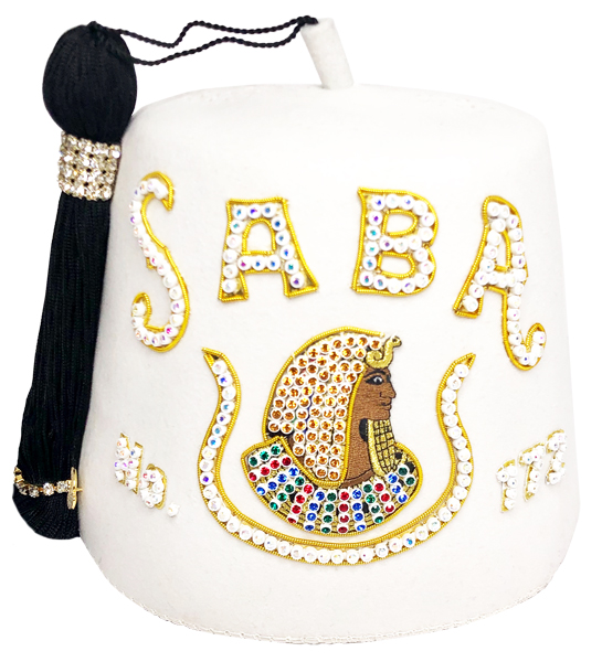 Single row Daughters of Imperial Court jeweled fez with your court name. The fez includes an 18" tassel and has 4 rows of rhinestone banding, stitched down at the top of the tassel. The fez body is 100% white felt with a ventilated top. This fez is available with plastic back or metal back rhinestones. The price also includes your court number and the rhinestone Daughters emblem.