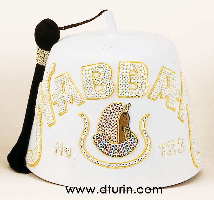 Triple row Daughters of Imperial Court jeweled fez. The tassel is 24" in length and has 4 rows of rhinestone banding, stitched down at the top of the tassel. Also included is a white fez stiffener. The fez body is 100% white felt with a ventilated top. This fez is available with plastic back or metal back rhinestones. The price also includes your court number and the rhinestone Daughters head emblem.