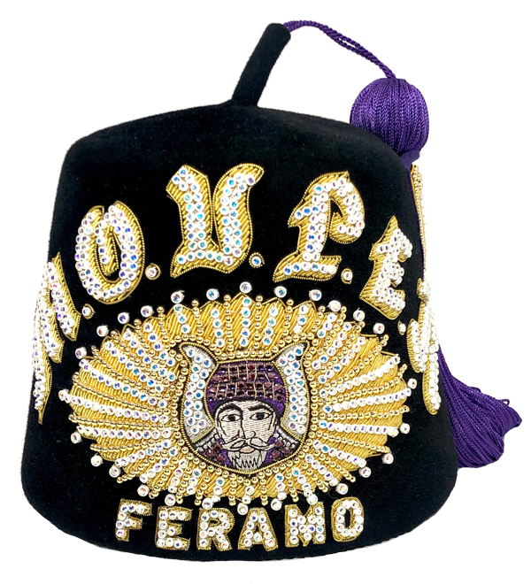 Deluxe bullion and double row jewel fez with plastic back or crystal metal back rhinestones in M.O.V.P.E.R. and sunburst gold bullion braiading,and trimmed with gilt jaceron. This fez includes a 24" purple tassel with deluxe Mokanna tassel holder. The fez body is 100" black wool felt with ventalied top.