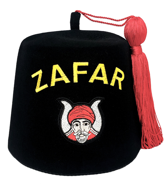 Grotto fez with yellow thread embroidery. The Monkanna emblem is also embroidered. This fez comes with an 18" red tassel and black zipper bag. The fez body is 100% wool felt with ventaliated top.