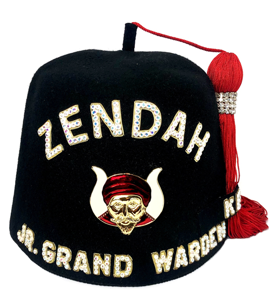 Grotto Prophet Fez with a single row of Aurora Borealis plastic back rhinestones and a metal Mokanna emblem pin. This fez includes an 18" red tassel with rhinestone banding. The fez body is 100% wool felt with a ventilated top. A black zipper bag is also included.