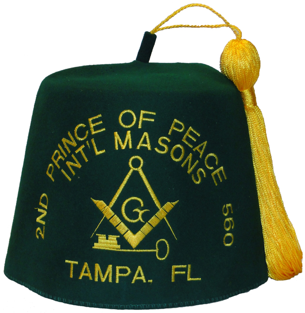 Machine embroidered International Masons Fez. This fez includes the masonic emblem, your lodge name, lodge number, city, and state. The fez comes with an 18" tassel that is stitched down at the top of the fez. The fez body is 100% wool with a ventilated top.