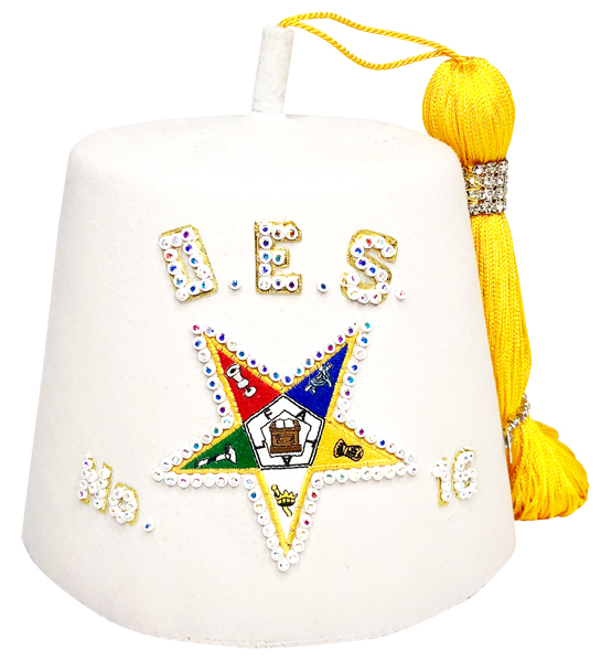 The Deluxe Single Row Eastern Star Jeweled Fez is an elegant and high-quality piece designed for members of the Order of the Eastern Star. This fez features "O.E.S." embroidered at the top in sparkling plastic back rhinestones. The beautifully embroidered Eastern Star emblem is also lined with matching plastic back rhinestones, enhancing its distinguished look. It includes a 24" tassel with four rows of rhinestone banding, securely stitched at the top for durability. The standard tassel color is gold, but white and black options are also available—please check with your state for tassel color requirements. This fez is a perfect combination of tradition, quality, and style.