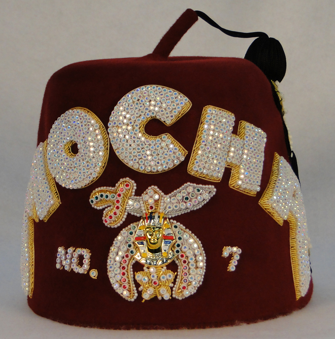 Deluxe bullion and six row jeweled fez with your temple name. The rhinestones are over gold hand embroidered bullion thread. This fez comes with a 24" tassel. The tassel holders are deluxe bullion and jewels to match the lettering on the fez. A crescent shaped tassel holder is located toward the top of the fez with a rectangular bar at the bottom of the fez. Also included is a custom embroiderd lining and red fez stiffener. The fez body is 100% red wool felt with a ventilated top. This fez is available with plastic back or metal back rhinestones. The price includes your temple number and the rhinestone Shrine emblem.