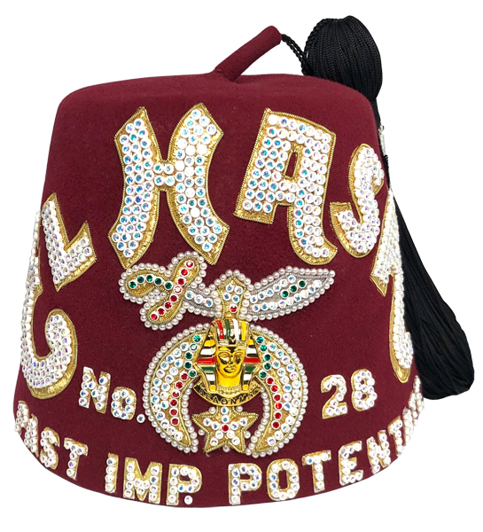 The Deluxe Triple Row Jeweled Fez features your temple name with rhinestones sewn over gold Mylar metallic thread for a striking appearance. It includes a 24" tassel with a large crescent-shaped tassel holder at the top, a custom embroidered lining, and a fez stiffener for added durability. The fez body is made of 100% red wool felt with a ventilated top and is available with plastic back or metal back rhinestones. The price includes your temple number and the rhinestone Shrine emblem.