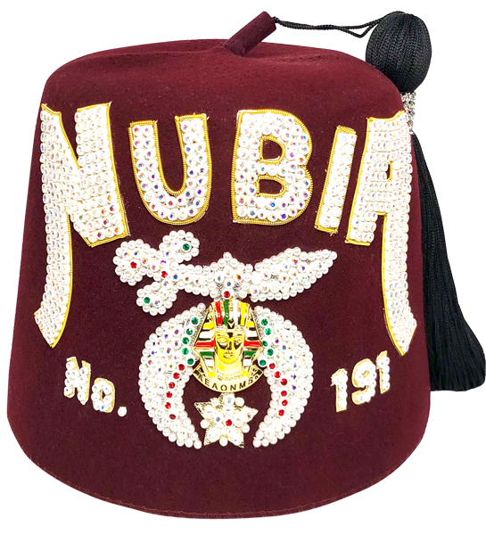 Quad and double row jeweled fez with your temple name. This fez has 4 rows of rhinestones on the first and last letter. The remaining letters are stitched with double row rhinestones. This fez comes with a 24" tassel and a large crescent shaped hand embroidered tassel holder at the top of the fez. Also included are an embroidered fez lining, with your name, and a fez stiffener. The fez body is 100% red wool felt with a ventilated top. This fez is available with plastic back or metal back rhinestones. The price includes your temple name, number, and the rhinestone Shrine emblem.