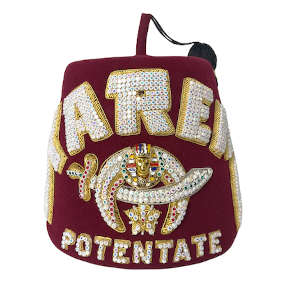 Deluxe bullion and quad row jeweled fez with your temple name. This fez comes with a 24" tassel and two tassel holders. A bullion and jeweled crescent shaped tassel holder is at the top of the fez and a bar at the bottom of the fez, you have the option of purchasing a custom bar if you would prefer. The four rows of rhinestones are over hand embroidered gold bullion. The fez body is available in 100% red wool felt or velour for an additional fee, both with a ventilated top. This fez is available with plastic back (white cup) or metal back (silver prongs) rhinestones. The price also includes an embroidered lining on the inside of the fez.