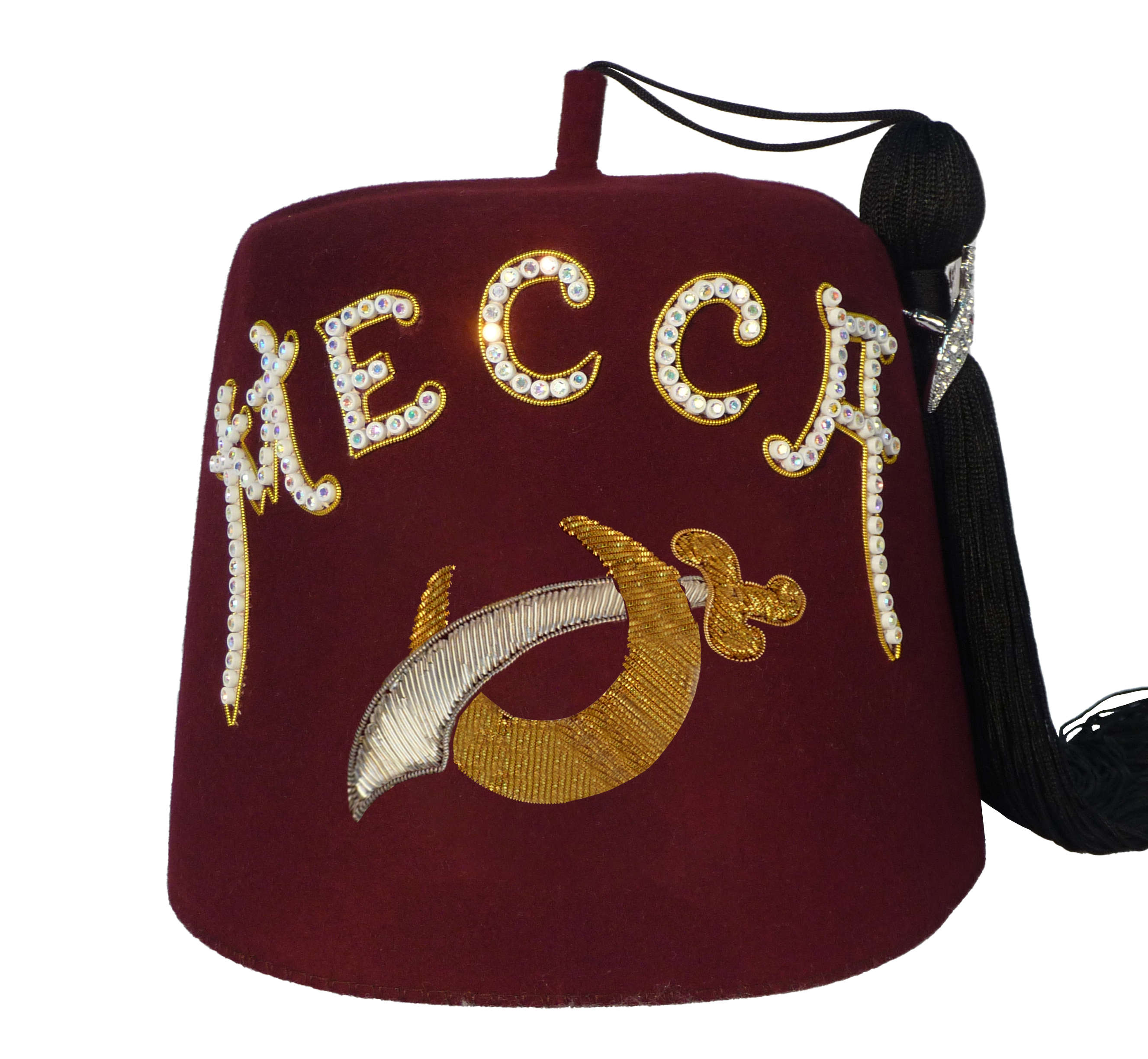 This single row jeweled fez is for Mecca Shrine members only. The fez comes with an 18" tassel and a tassel holder. The fez body is 100% red wool felt with a ventilated top. This fez is made with plastic back stones. The price includes your Shrine temple name, special bullion emblem, tassel, and tassel holder.
