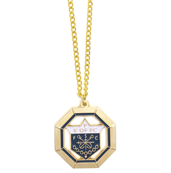 The K.P.C. Knights Medallion features a stunning gold-tone backing and comes with a 24" chain for a classic and distinguished look. Perfect for Knights of Peter Claver members, this medallion is a symbol of faith and commitment.