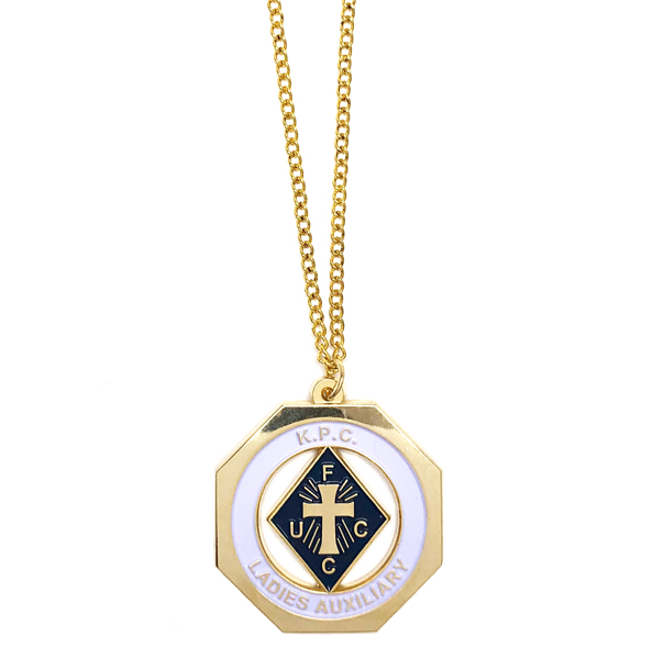 K.P.C. Ladies Medallion with a gold tone backing and chain. The chain meassures 24".