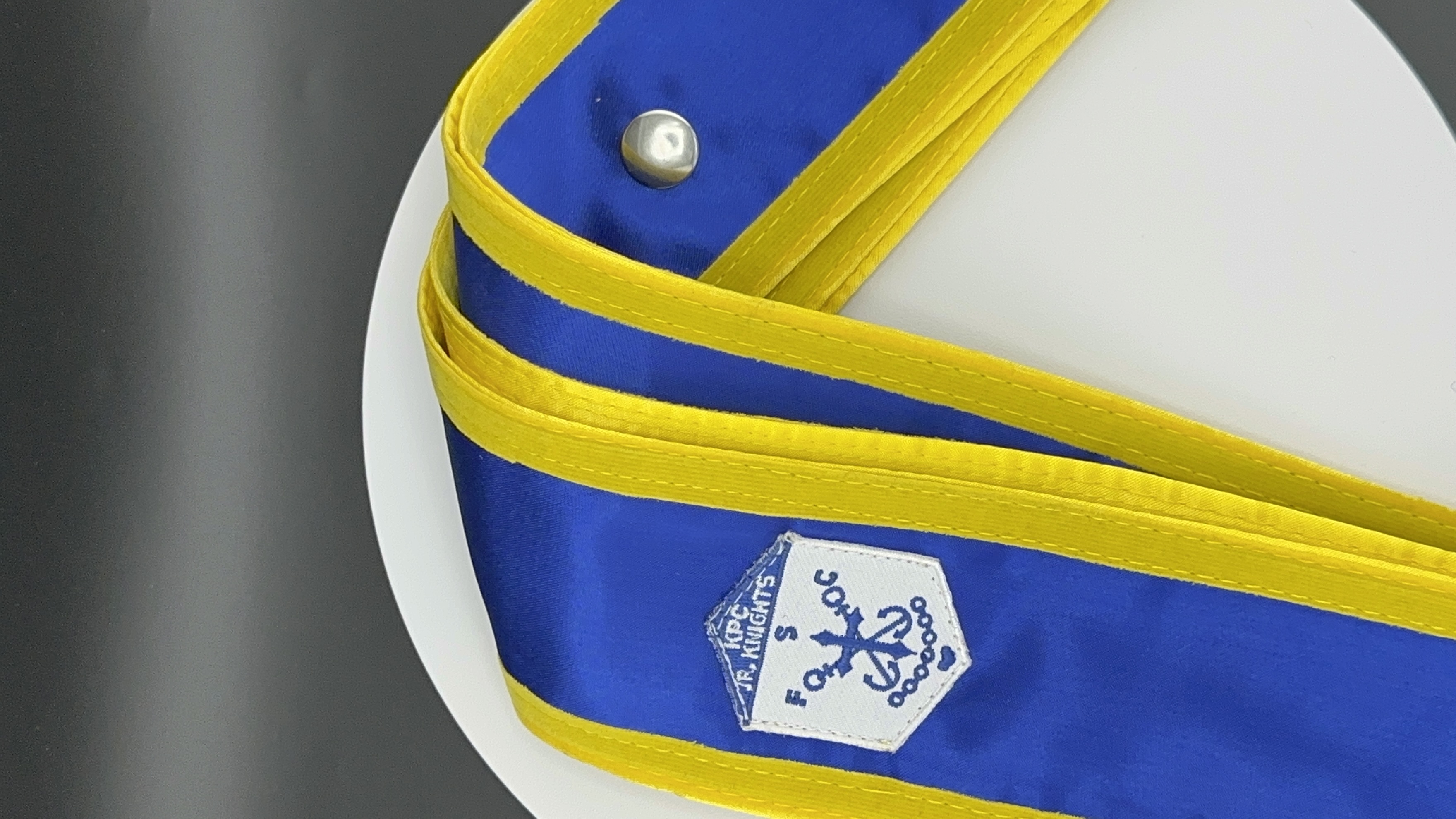 Knights of Peter Claver Junior Sash. This sash has the JR. K.P.C. emblem on the front. There is a snap closure on the bottom. This sash comes in a small, medium, and large length. The small is 56" long, the medium is 68" long, the large is 72" long, the xlarge is 80" and the xxlarge is 88". Please select the correct size when you order.