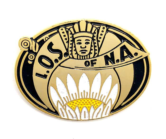 Ladies Oriental Shrine pin, large LOSNA emblem. The lotus flower is located on the bottom of the pin facing up. The flower has white petals and a yellow center. The pin is gold-tone with black accents. The pin is 1" in height.