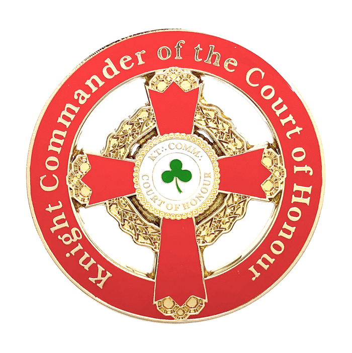 The deluxe KCCH car emblem has a red ring with Knights Commander of the Court of Honour going around it. The KCCH emblem is located in the center of the ring. The car emblem is 3 inches in diameter and is made of zinc metal with a strong peel and stick backing.