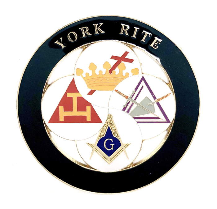 The deluxe York Rite car emblem has a black ring with York Rite across the top. The York Rite logo is in the center of the emblem. The car emblem is 3 inches in diameter and is made of zinc metal with a strong peel and stick backing.