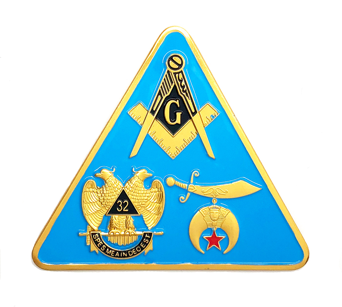 This tri-logo car emblem is triangular shaped with the Masonic, Scottish Rite, and Shrine emblems in each co er. The car emblem has a blue background with a gold border. The car emblem is made out of long lasting aluminum and has a self adhesive backing. It measures 3 inches.