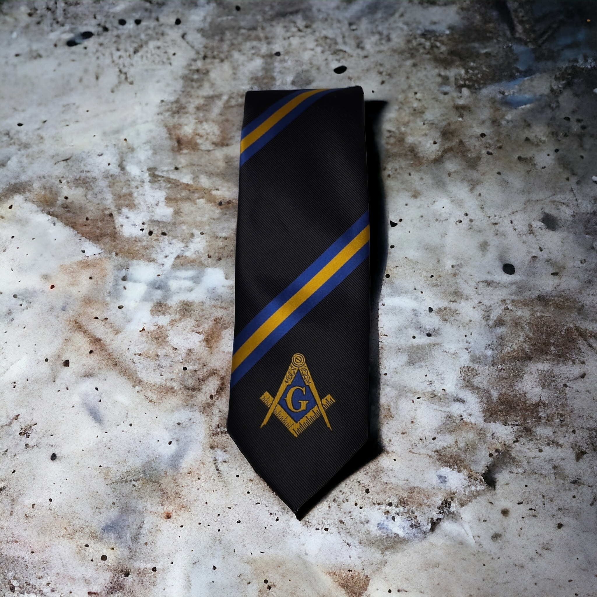 BLACK, BLUE, GOLD STRIPE TIE WITH GOLD MASONIC LOGO