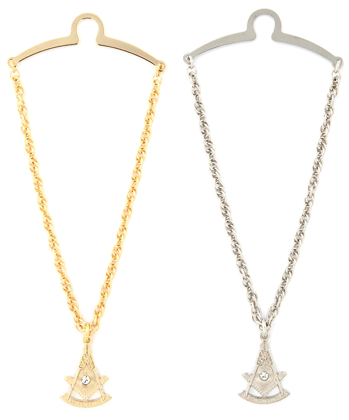 Tie chain with hanging Past Master emblem. The Past Master emblem has a clear stone in the center of the squsre. This chain measurers 2" wide and 3 1/2" in height. It is available in both gold and silver colors.
