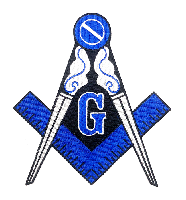 Large Masonic iron-on emblem. This emblem is blue, white, and black. It is fully embroidered with an iron-on back. The emblem measures 6 in height.
