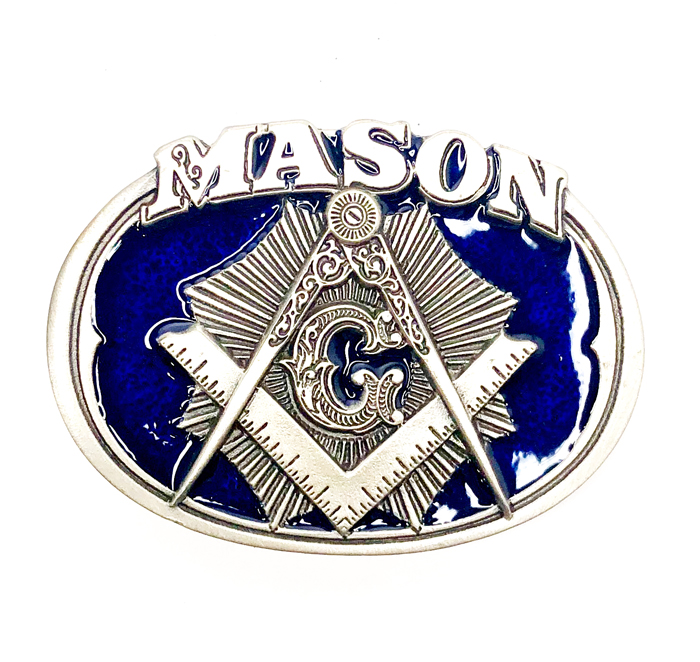 The Masonic Belt Buckle is crafted from durable pewter metal with a striking blue enamel background. Featuring the word "Mason" at the top and the iconic Masonic emblem below, this buckle is a distinguished accessory for any Freemason. Measuring approximately 3" in length, it adds a timeless touch to any belt.