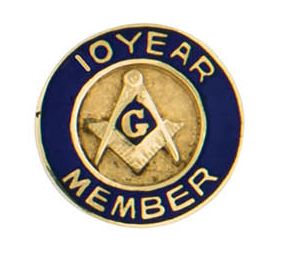 The Masonic 10 year member pin is round with the Masonic emblem in the center. The outer blue ring reads "10 Year" on top and "Member" on the bottom. The pin measures 1/2" in diameter.