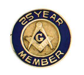 The Masonic 25 Year member pin is round with the Masonic emblem in the center. The outer blue ring reads "25 Year" on top and "Member" on the bottom. The pin measures 1/2" in diameter.