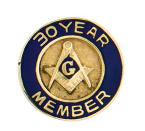 The Masonic 30 year member pin is round with the Masonic emblem in the center. The outer blue ring reads "30 Year" on top and "Member" on the bottom. The pin measures 1/2" in diameter.