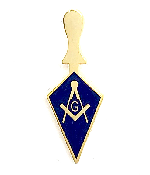 Pin is in the shape of the trowel with a dark blue background and the Masonic square and compass in the center. The trowel handle and the pin outline is gold-tone. The pin has a clutch pin back and measures 3/4".