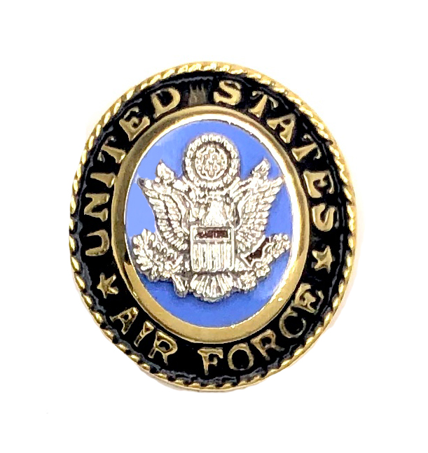 Air Force Military Pins. This gold-tone pin has a light blue background. The Air Force logo is in the center and the wording, United States Air Force, goes around the border of the pin.