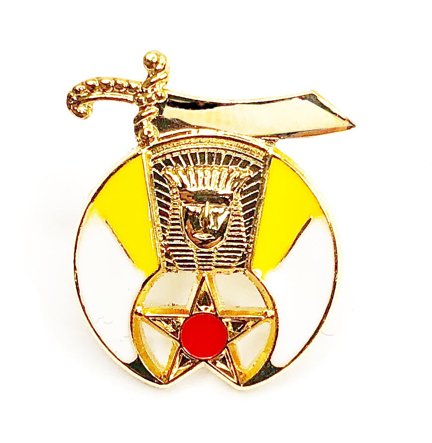 Large Shrine lapel pin. This gold-tone pin is the sword above Shrine emblem. The crescent is colored with white and yellow enamel, and the star is colored with red enamel. This pin measures 5/8" by 5/8".