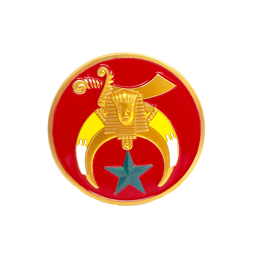 Shrine 2" car emblem with a red background. The Shrine emblem is gold-tone, white, and yellow with a green star. The car emblem is made out of long lasting aluminum and has a self adhesive backing. It measures 2 inches.