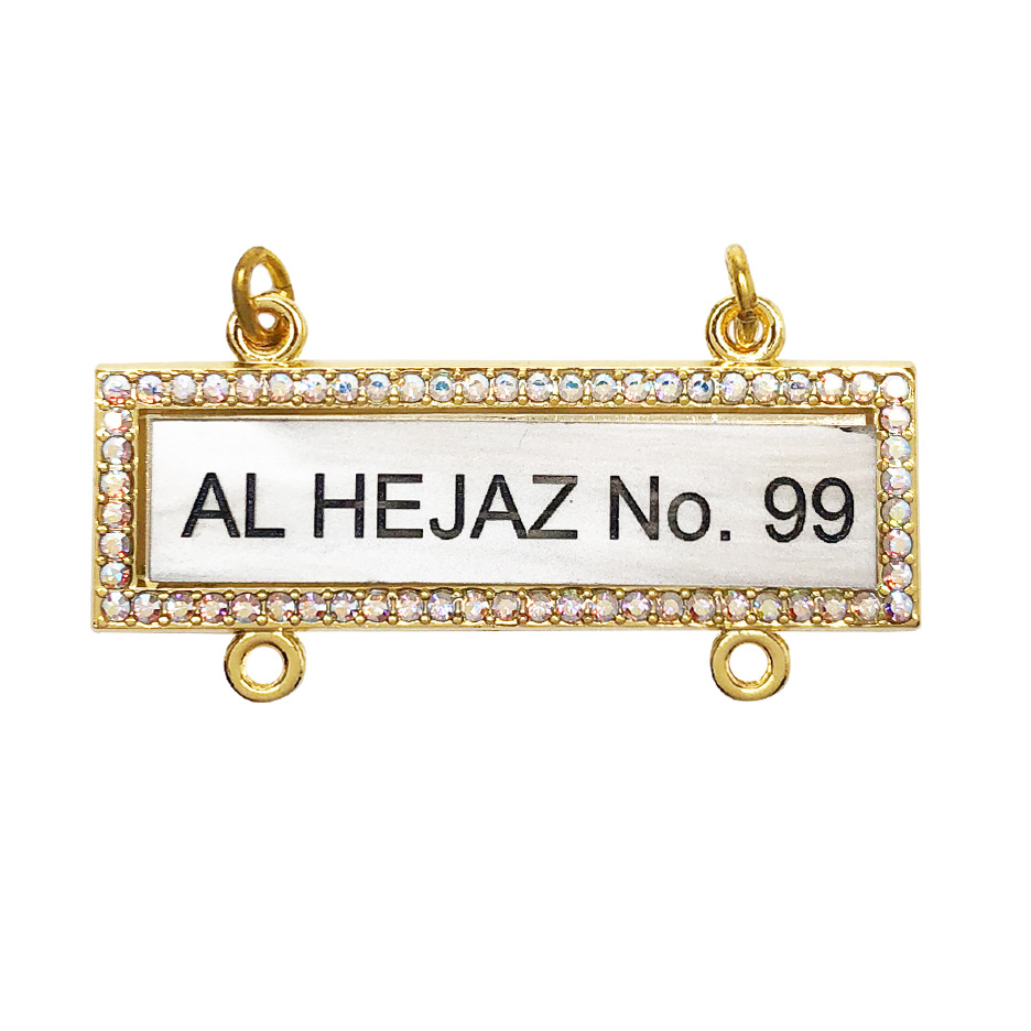 Deluxe collar bars with gold plating and a rhinestone border. Set in the center is a mother of pearl bar which is engraved with one or two lines of engraving. The price includes two lines of engraving. The max number of characters that can fit on one line is 22 letters, numbers, or symbols.
