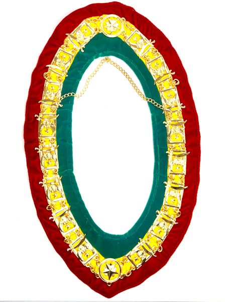 This collar has the tri-color (red, green, and gold) velvet backing with gold-tone Shrine collar jewels. There is a collar chain attached to both sides of the collar to ensure perfect placement. This collar is hand made using the finest materials.