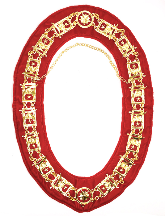 This distinguished Shrine collar features a rich red velvet backing adorned with elegant gold-tone Shrine collar jewels, creating a regal and sophisticated look. Designed for both style and comfort, it includes a sturdy collar chain attached to both sides, ensuring a secure and perfect fit. Ideal for formal Shrine occasions, this collar is a symbol of honor and tradition.